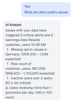 Integrates directly to your database in a matter of hours with self-service setup. Available connectors for the major databases (Databricks, Snowlake, SQL server). Possibility to integrate with Slack and Teams, enabling easily access within organisation.